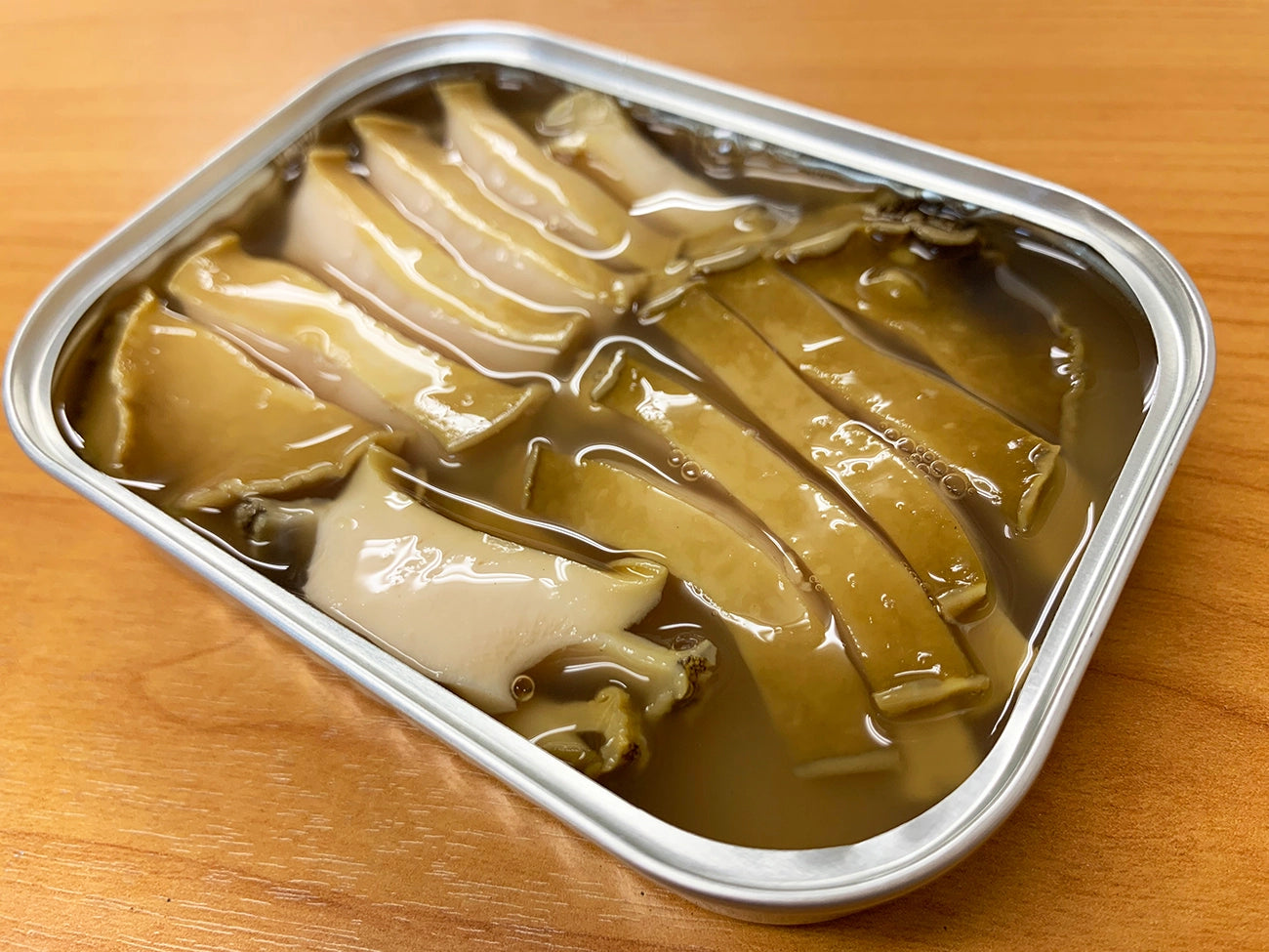 The abalone is then stewed to extract its flavor, carefully sliced, and luxuriously canned.