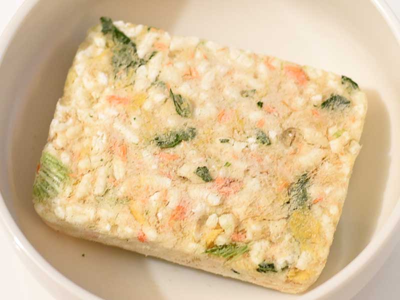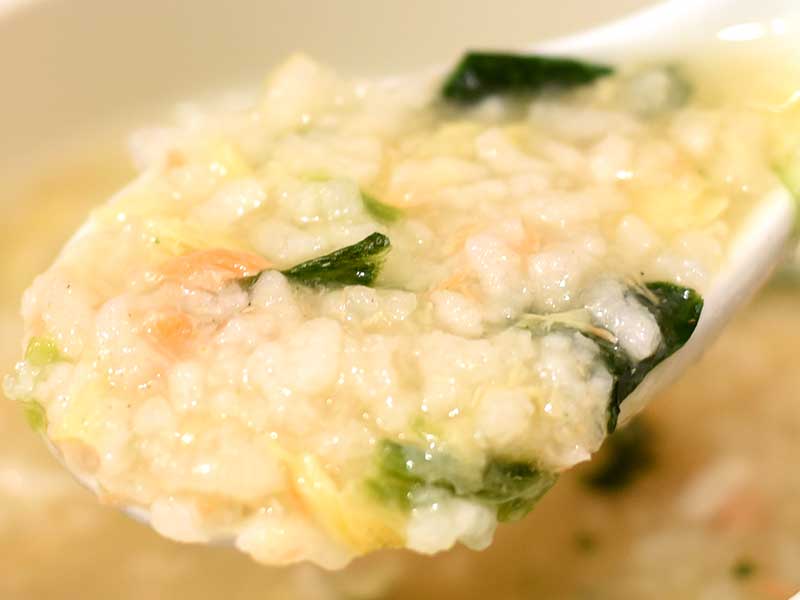 Koshihikari rice is used. Seafood-flavored broth based on bonito and kelp, with grilled sardines and other ingredients, is added, along with a colorful mix of ingredients such as unraveled sockeye salmon, egg, and spinach.