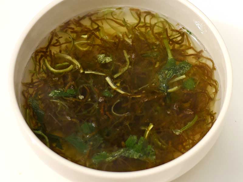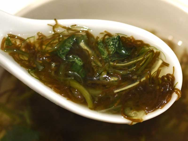 This soup is made with mozuku seaweed, wakame seaweed stems, mitsuba leaves, and yuzu peel, and allows you to enjoy two textures at the same time: the soft and smooth texture of mozuku seaweed and the crunchy texture of wakame seaweed stems.