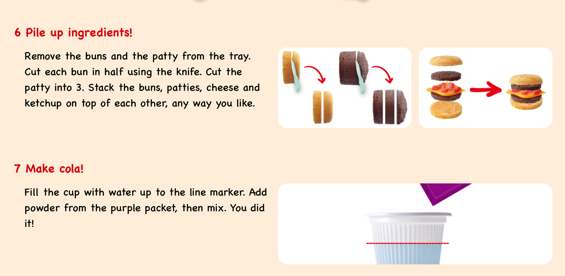 Remove the buns and the patty from the tray. Cut each bun in half using the knife. Cut the patty into 3. Stack the buns, patties, cheese and ketchup on top of each other, any way you like.