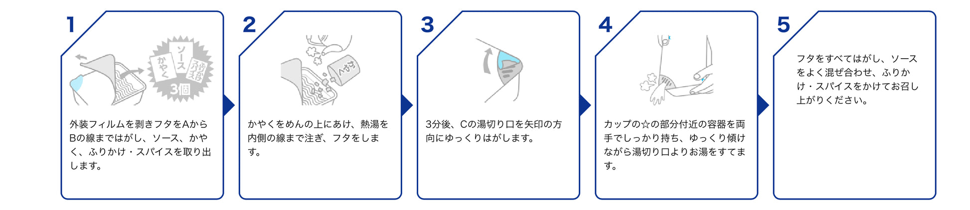 ①Peel off the lid from line "A" to line "B" and take out the sauce, ingredients, and furikake/spices.