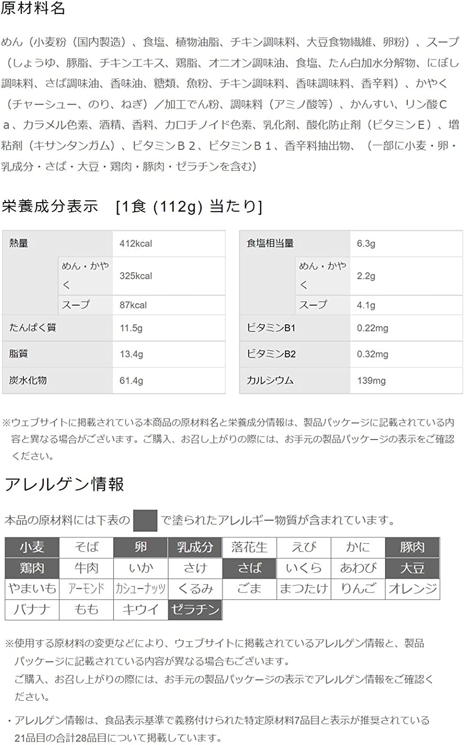 (per 112g) Energy: 412kcal, Protein: 11.5g, Fat: 13.4g, Carbohydrate: 61.4g, Salt equivalent: 6.3g, Vitamin B1: 0.22mg, Vitamin B2: 0.32mg, Calcium: 139mg